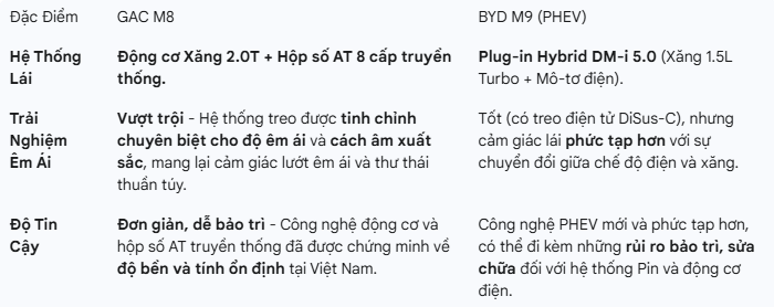 BYD M9 vừa chính thức ra mắt, mang đến công nghệ Plug-in Hybrid (PHEV) mạnh mẽ và nhiều trang bị cao cấp. Tuy nhiên, trong cuộc đua MPV hạng sang, GAC M8 vẫn vững vàng với vị thế của một lựa chọn tin cậy, êm ái và tối ưu chi phí vận hành, mang lại sự an tâm tuyệt đối cho giới thương gia.