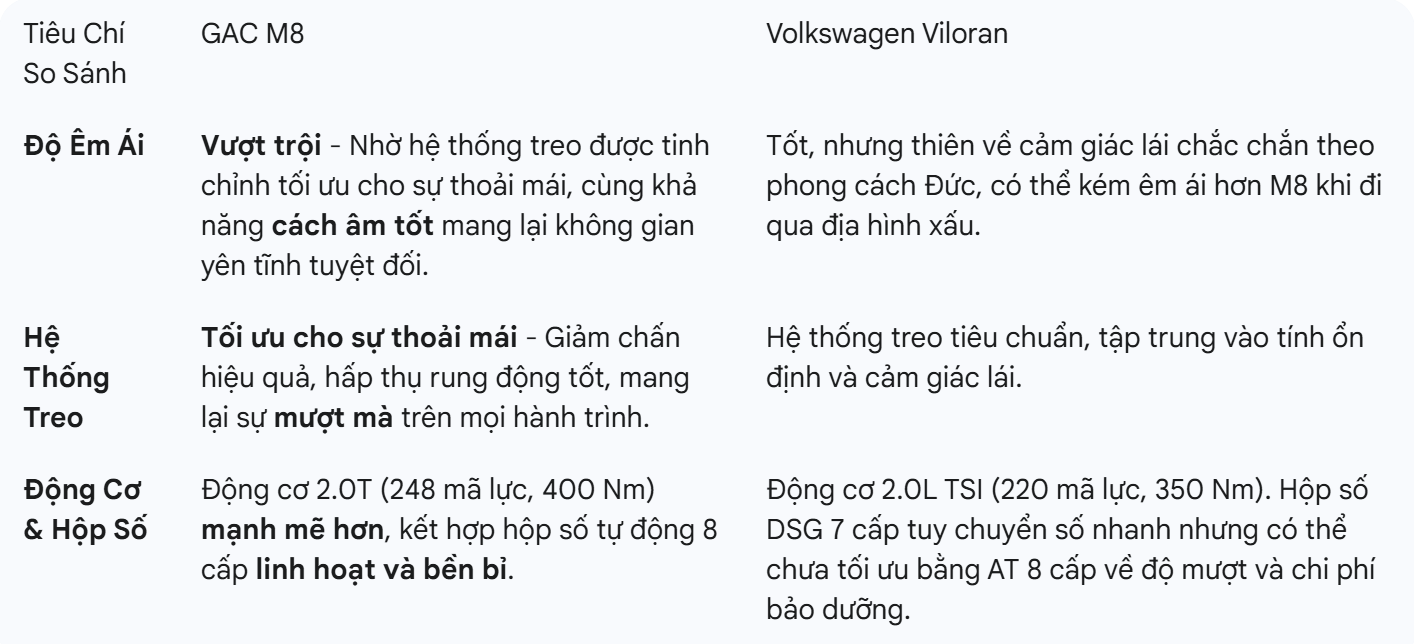 👉 Kết luận: GAC M8 mang lại trải nghiệm vận hành êm ái, thư thái đúng chuẩn xe thương gia hơn so với Viloran.